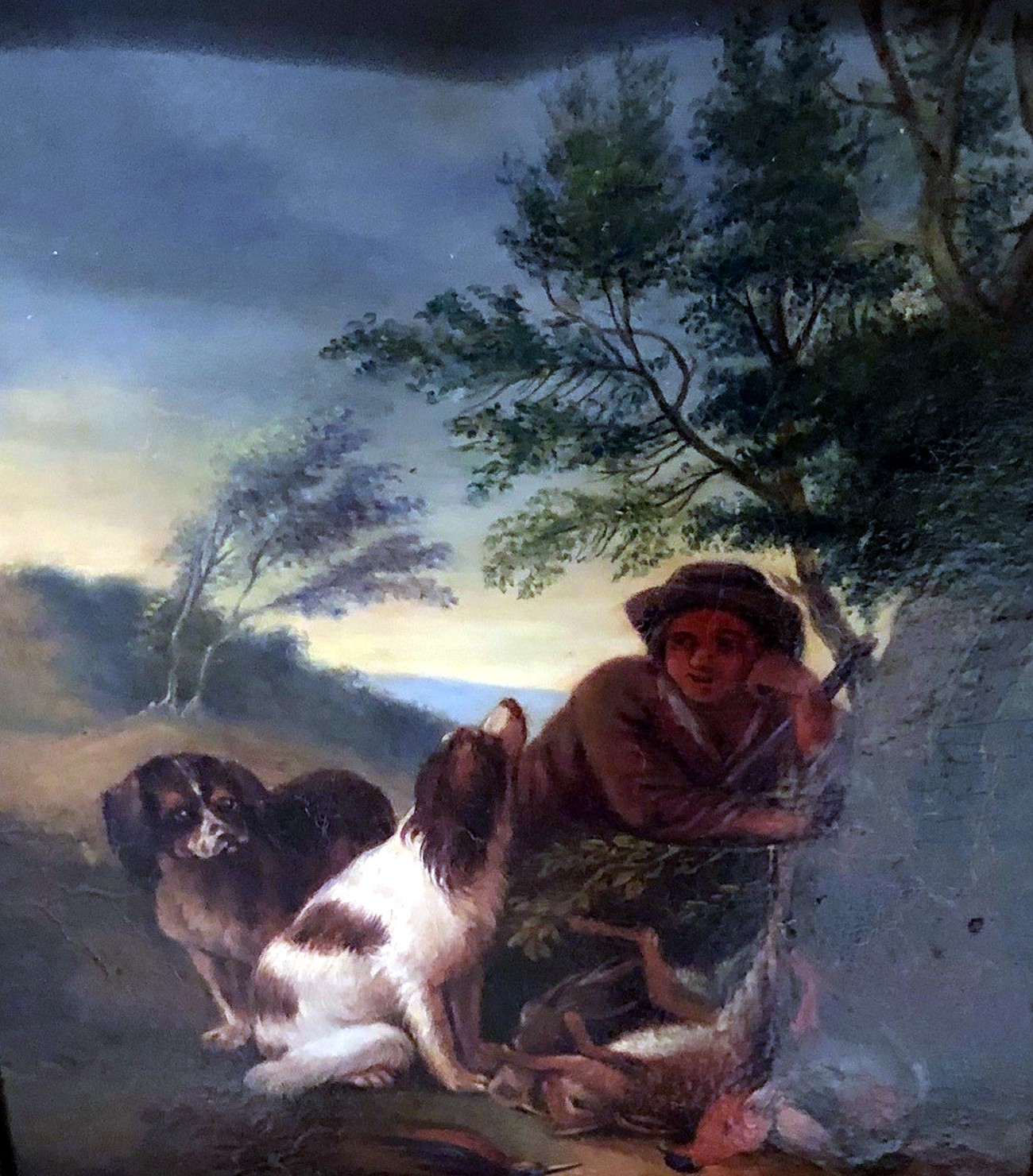 The painting of a hunter and his two dogs is by Arthur Wardle.  Arthur Wardle was born in Chelsea, England.  As a teenager. he exhibited at the Royal Academy of England.  He was considered a prodigal with no formal education in art, he was primarily self-taught.  His body of works consisted of portraits of well-dressed women and children with dog breeds of the Edwardian times.  He also painted wild animals such as leopards and lions that he studied at the zoo.