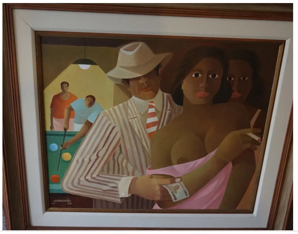 This is an oil on canvas painting, signed and dated Jaimendes 84. The painting is in excellent condition depicting a man and woman in a barroom with pool players in the background.