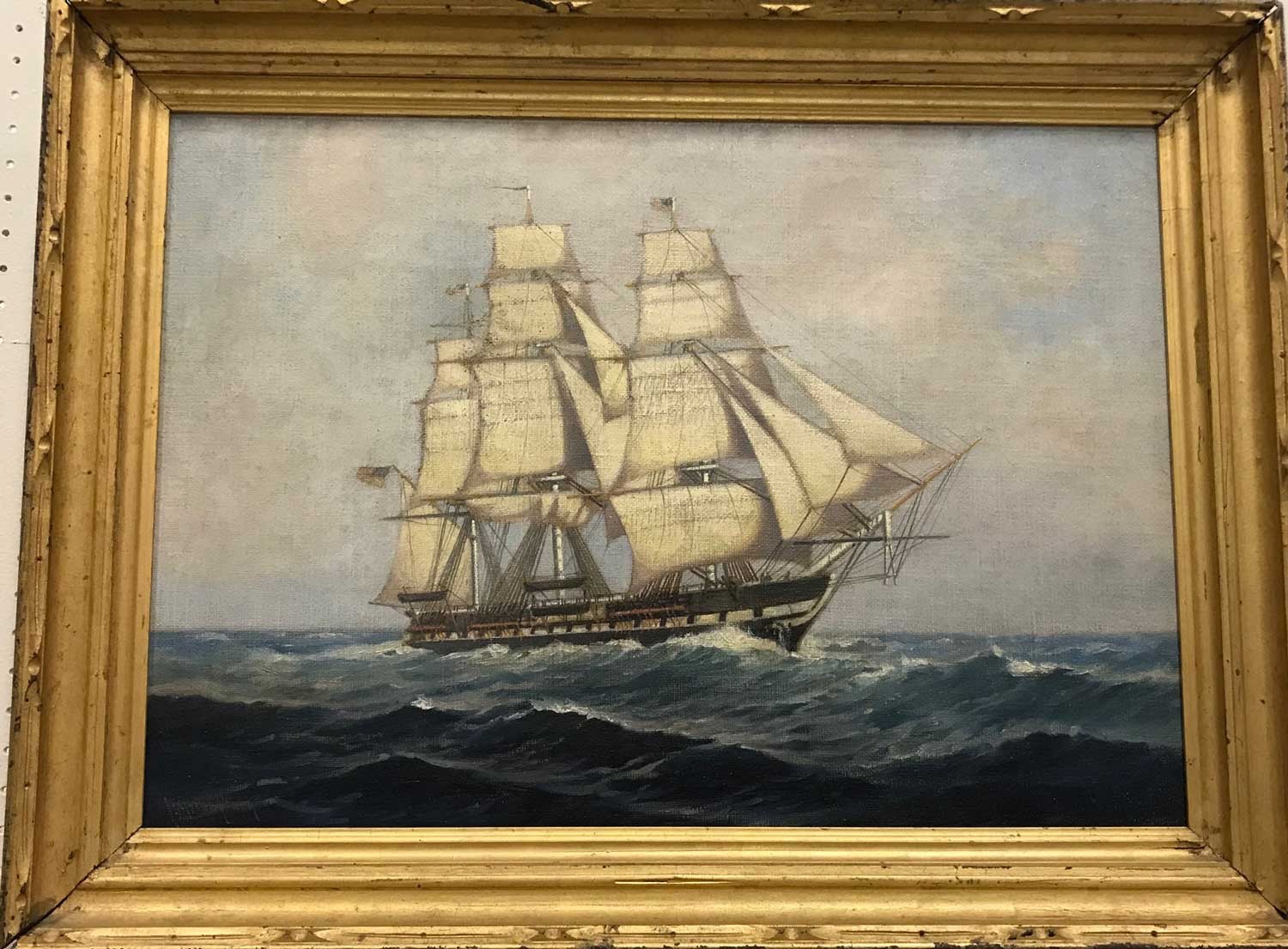 Size: framed 24 x 31.5. Medium: oil on canvas. Signed: lower left. Scene: the constitution