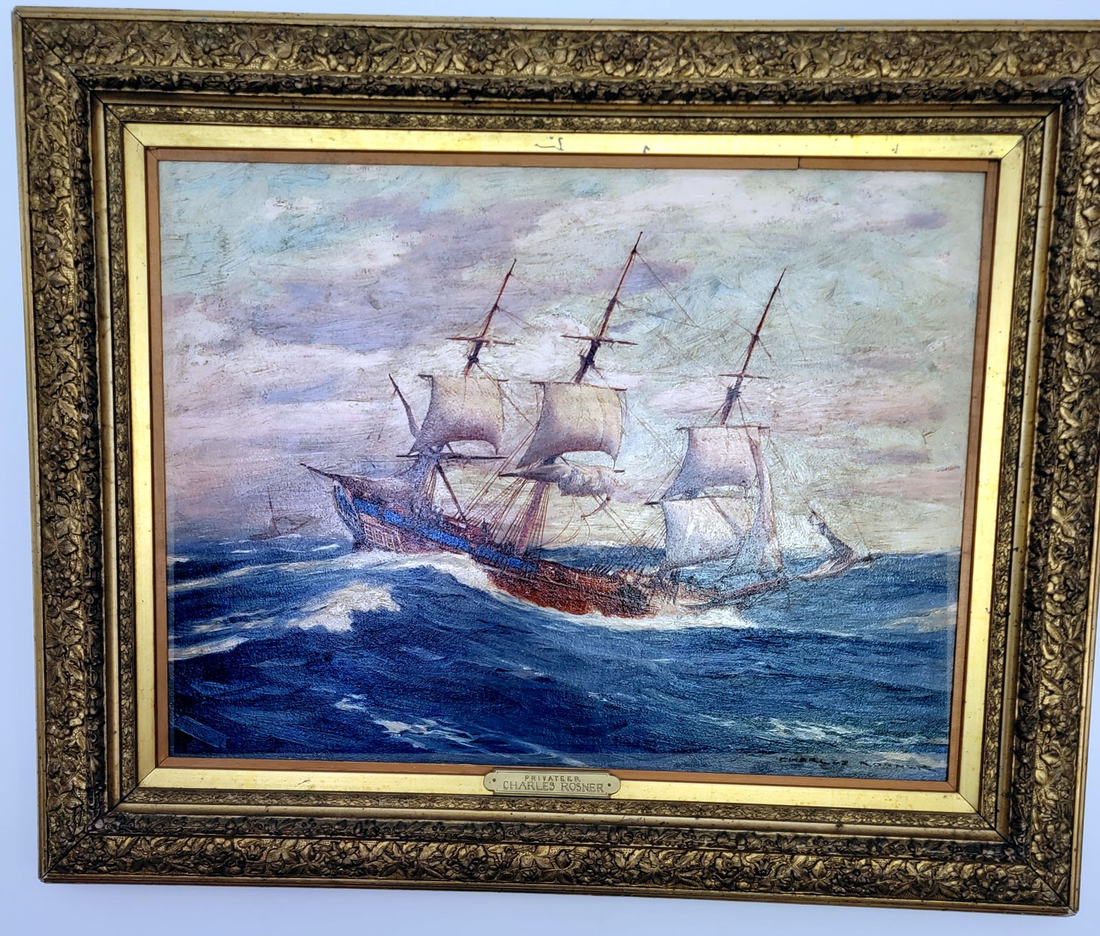 Charles Rosner was born in 1894 in Langendorf, Germany, where he developed a real fascination for the sea and ships. He served aboard several sailing ships that he admired in his youth. He sailed around cape horn an impressive five times before leaving his seaman’s life in Iquique, Peru. He worked in the copper mines during World War I duration. Rosner immigrated to Canada first and then to America. He married in New York City and established a permanent home. He went back to his first love, the sea. He became a full-time marine painter of historic vessels and maritime subjects. He did not get a lot of recognition for his work when he was alive, but he is recognized in several museums.