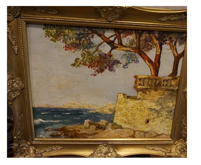 The painting is a beautiful coastal scene, oil on board signed on the lower right. The painting is good condition no repairs and framed.