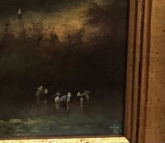 The landscape by Elisha Taylor Baker is an oil on canvas, initialed on the right side, measures 12 x 10, and is beautifully framed
