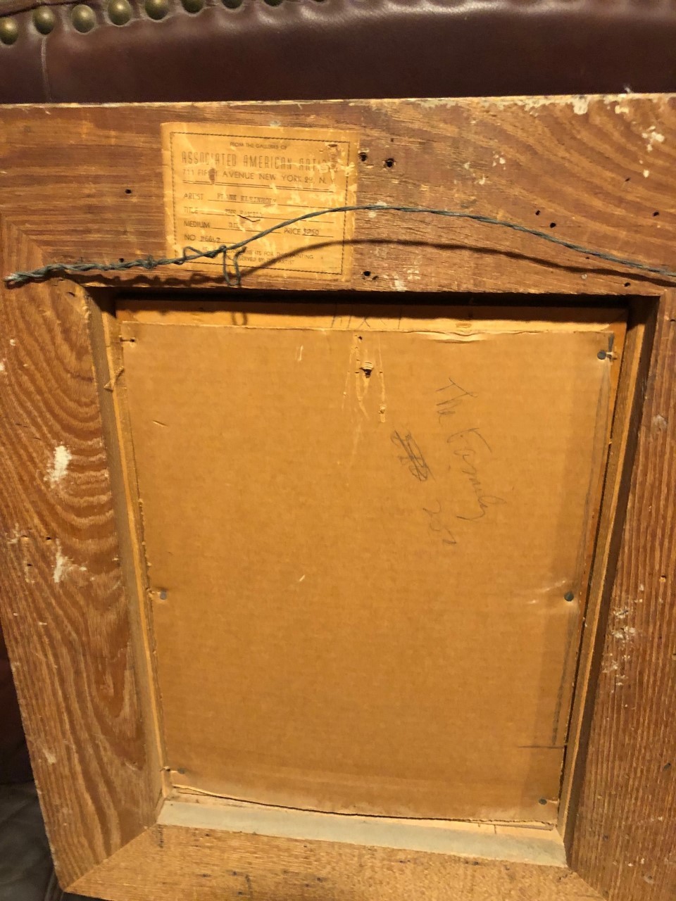 This painting is an oil on board signed on the upper left-hand corner, measures 24 x20 in a wood frame.  On the back of the painting, it is titled “The Family.”