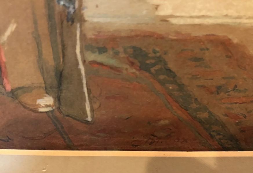This painting is a watercolor faintly signed Frank Wolcott. There is very little written about Wolcott except that he was a portrait painter. The boy is dressed in military garb.