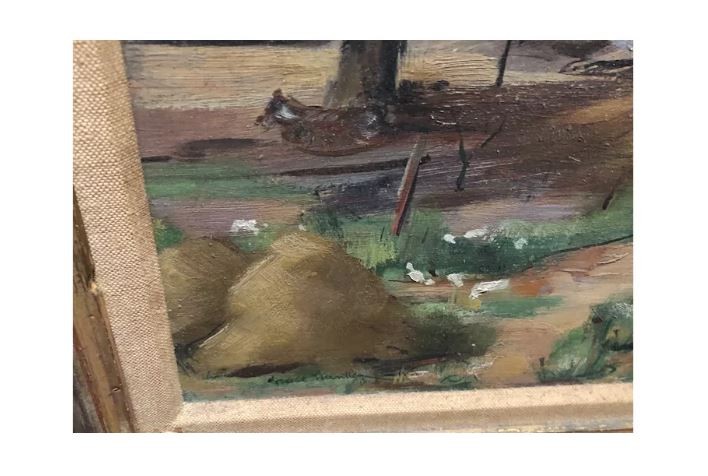This painting is an oil on canvas signed on the lower left. The painting of a barn possibly somewhere in Gloucester.