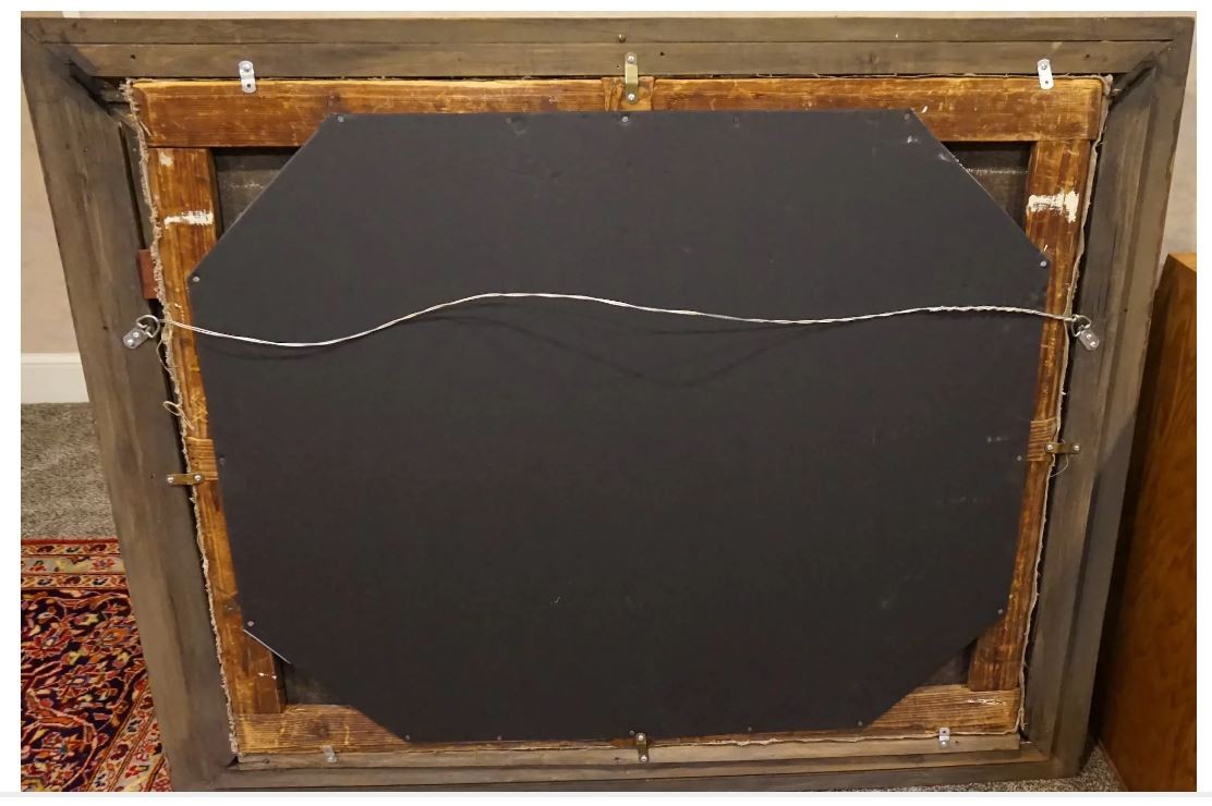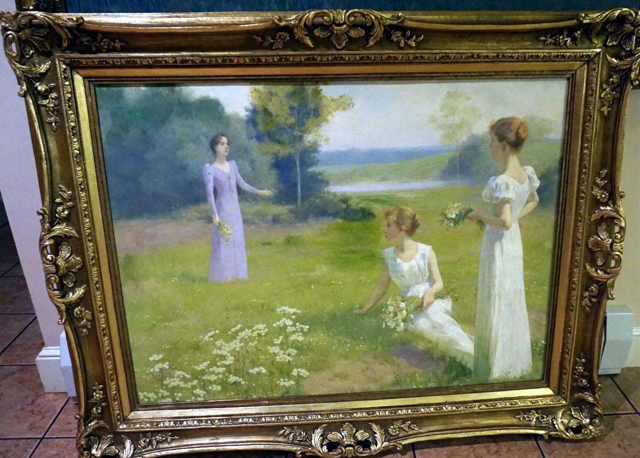Size: w/o frame. 32x39.5. Medium: oil on canvas. Signed: lower right scene: 3 women picking flowers