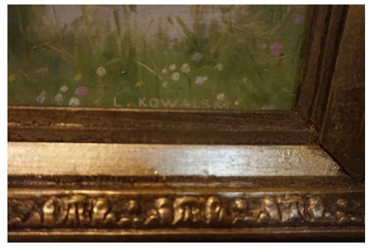 This impressionist painting is by Leopold Franz Kowalski. Mr. Kowalski was a Russian/Federation artist was born in 1856 and died in France in 1931. The painting is an oil on canvas, signed lower right and the work has been relined. The Ladies in the Meadow is beautifully executed and measures 34 x 48 in nice gold frame.
