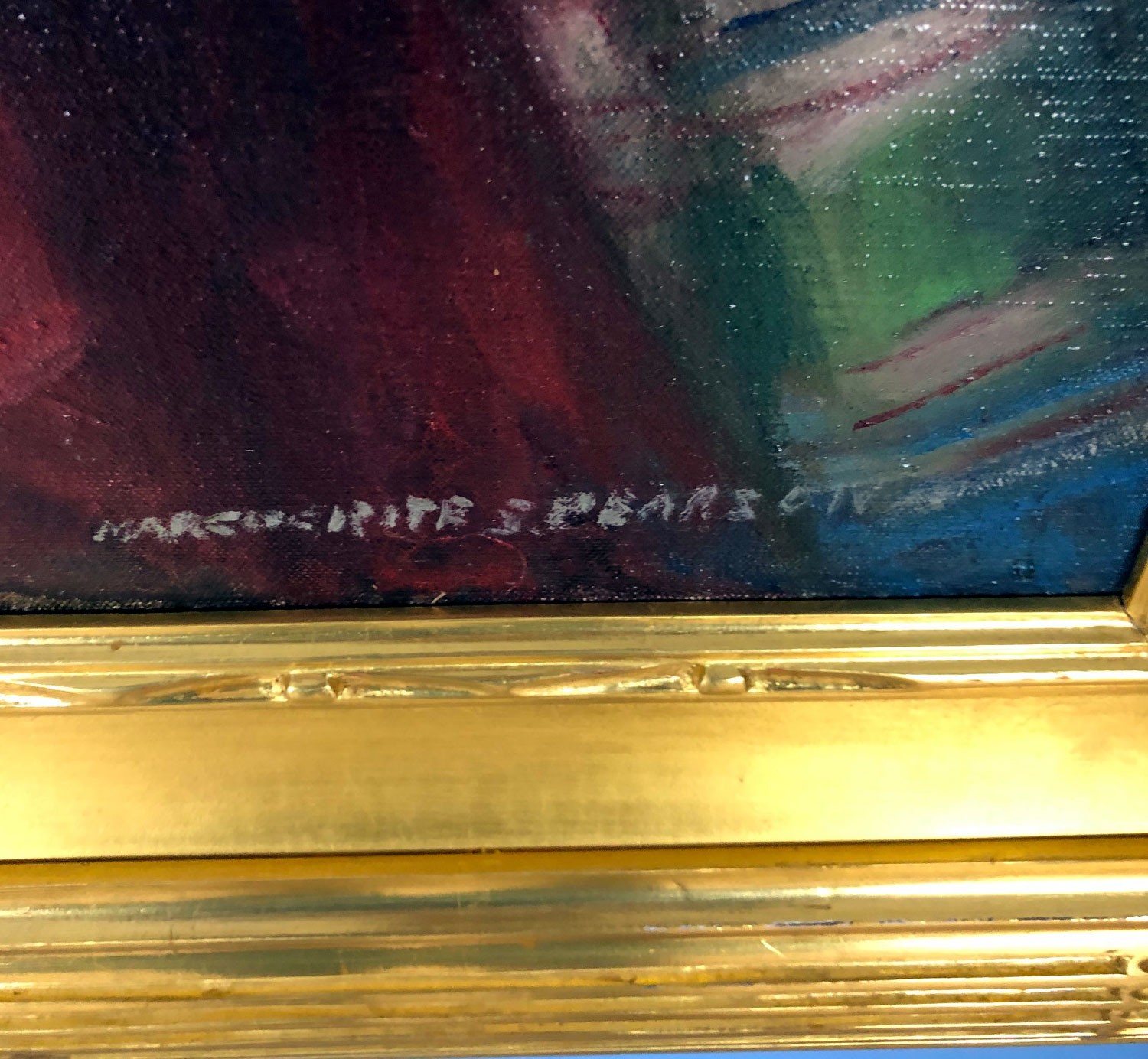 The painting by Margurite Pearson is an oil on canvas signed lower right. The image depicts a woman at a dressing table and measures 41.5 x 36.5. Pric