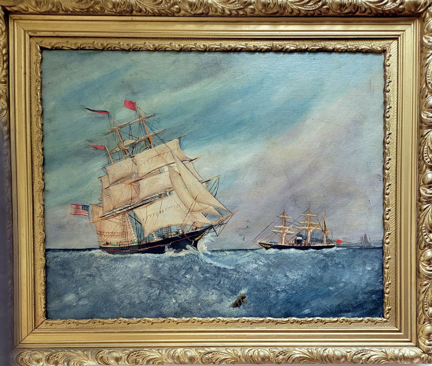 The painting is an oil on canvas, signed lower right, of a ship with two ships in the background.