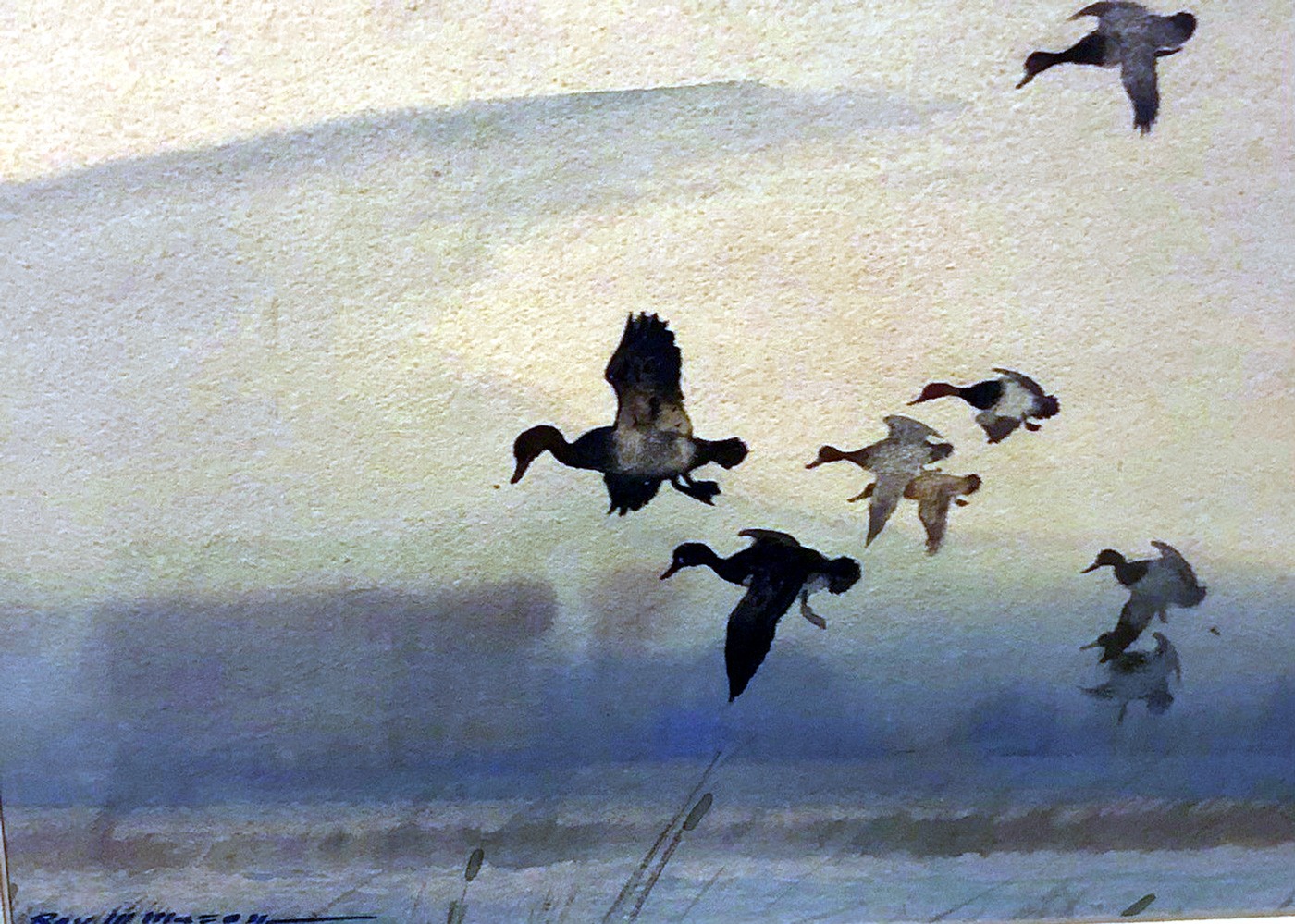 The watercolor of ducks flying over a marsh, signed on the lower left.