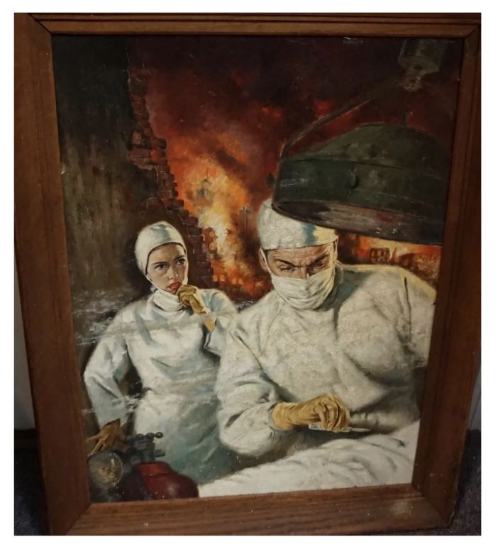 This is an interesting illustration of a battle scene with a nurse and doctor working on a wounded soldier, while the war rages on behind them. The painting is oil on artist board signed on the lower right. It is framed in a plain wood frame and measures 29 x 22. The painting is in good condition.