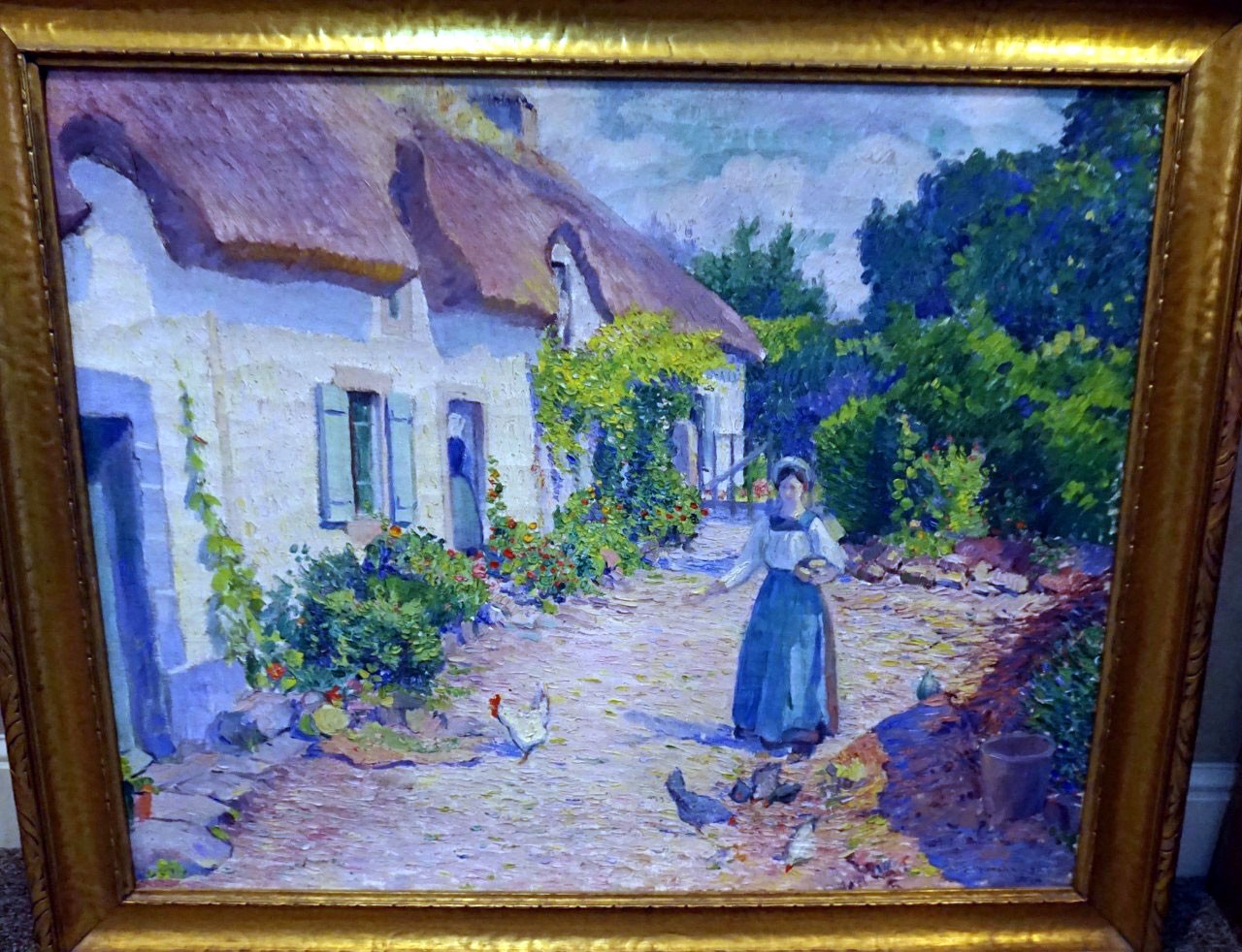 Abel Warshawsky was born in 1883 in Sharon, Pennysylvania, he was raised in Cleveland, Ohio. He studied at the Cleveland Art Institute, National Academy of Design and the Art Students League. Mr. Warshawsky left for Paris in 1905. He lived and painted in Europe for the next 25 years. The painting by Mr. Warshawsky is from the time he spent in Europe. The woman is dressed in typical clothing of the time feeding the chickens, with a thatched roof building behind her. The painting is an oil on canvas signed on the lower left and dated 1914. The painting is in excellent condition in a plain gold frame. Mr. Warshawsky moved back to the United States in 1940 and settled in Carmel, CA until his death in 1962