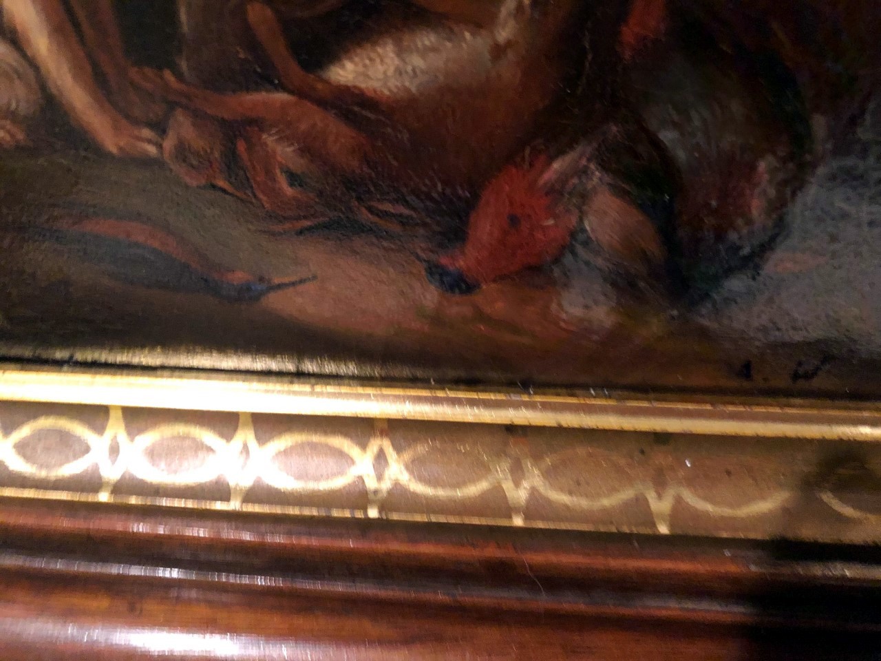 The painting of a hunter and his two dogs is by Arthur Wardle.  Arthur Wardle was born in Chelsea, England.  As a teenager. he exhibited at the Royal Academy of England.  He was considered a prodigal with no formal education in art, he was primarily self-taught.  His body of works consisted of portraits of well-dressed women and children with dog breeds of the Edwardian times.  He also painted wild animals such as leopards and lions that he studied at the zoo.