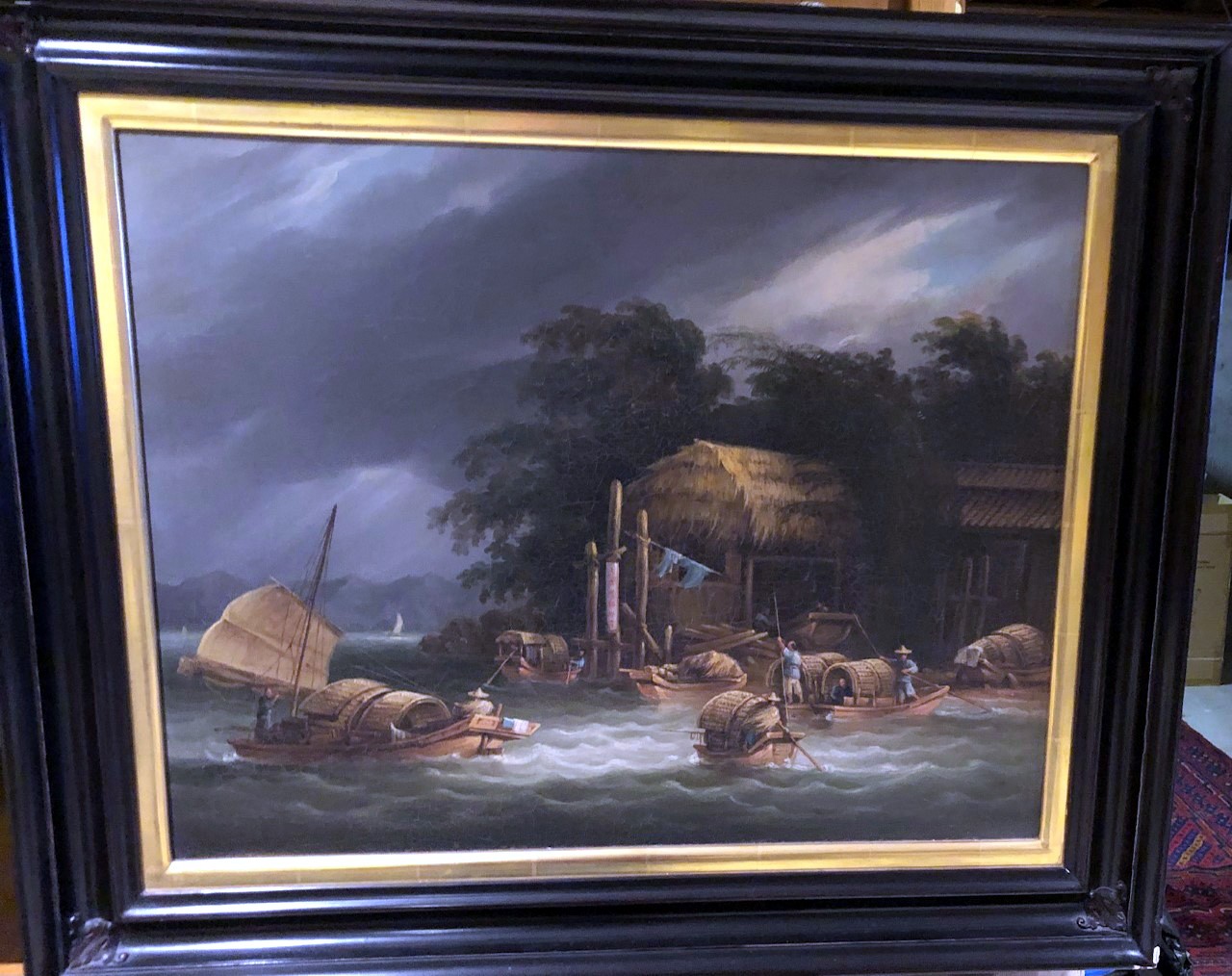 . The artists of China Trade pictures were from different countries that painted what they saw during this period. This is a very busy painting with a lot of small boats moving through the ocean with Chinese manning their crafts. The painting measures 20 x 24 in a black frame and is on canvas.