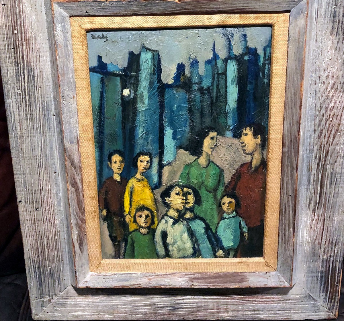 This painting is an oil on board signed on the upper left-hand corner, measures 24 x20 in a wood frame. On the back of the painting, it is titled “The Family.”