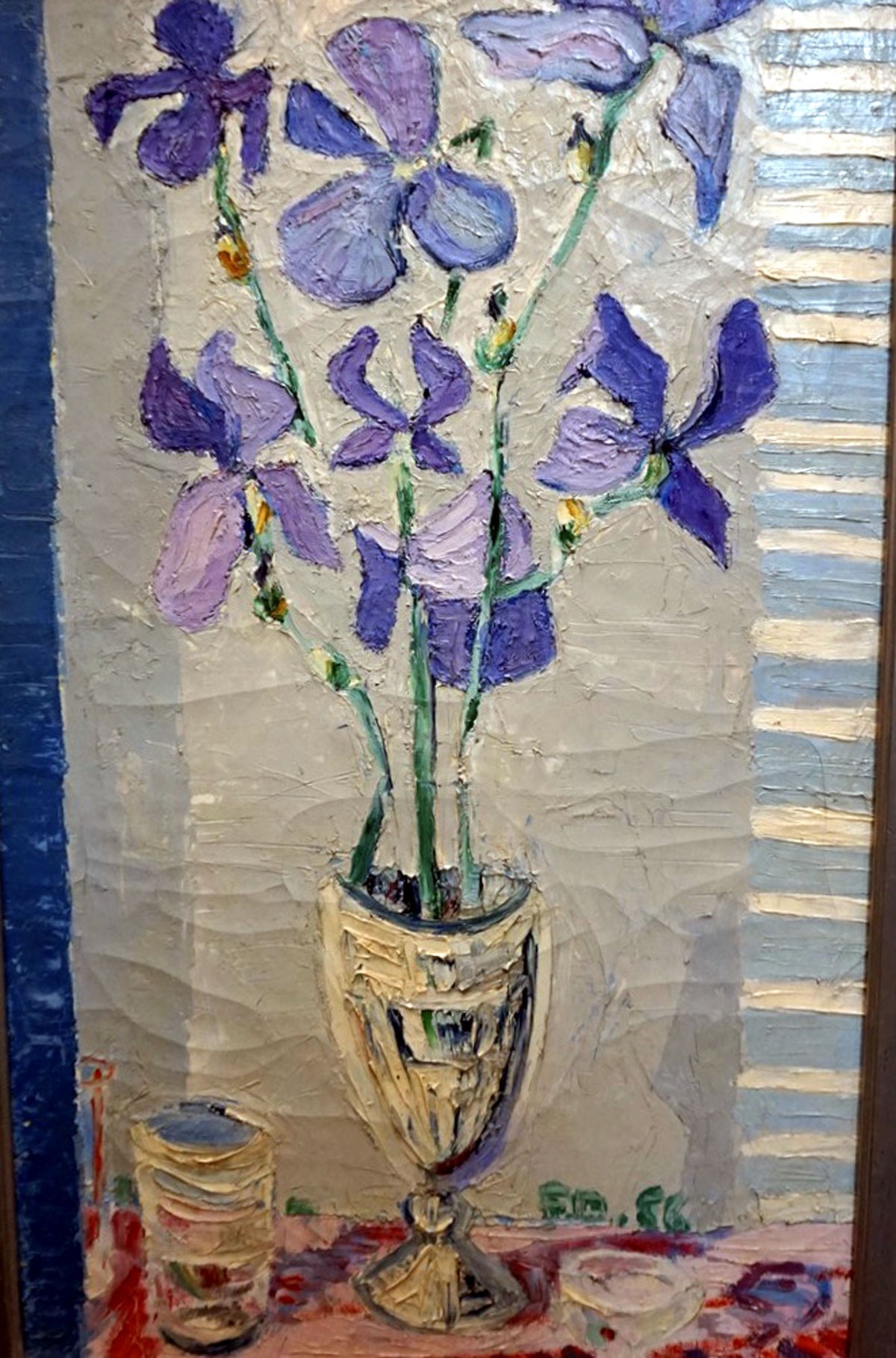 This Franklin Drake  is a whimsical painting of purple flowers. Drake was born in 1929 and died in 2001. He was known for his murals, mixed media and conceptual art. In 1972 he was commissioned to decorate a Buick and a Chrysler for the Rolling Stone, John and Yoko Lennon et al. The painting is an oil on canvas signed in the middle front of the work. There is also a label on the back with his name on it. The painting measures 36 x 22 including the silver frame and is in very-good condition.
