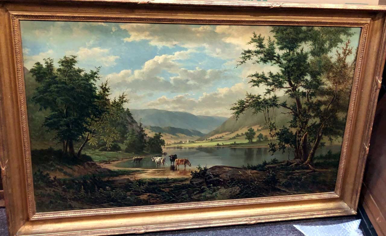 The Hudson River landscape with the cows in the stream was painted in 1880. The painting is an oil on canvas relined. It is signed and dated on the lower right. The painting measures 37 x 56 with the frame,