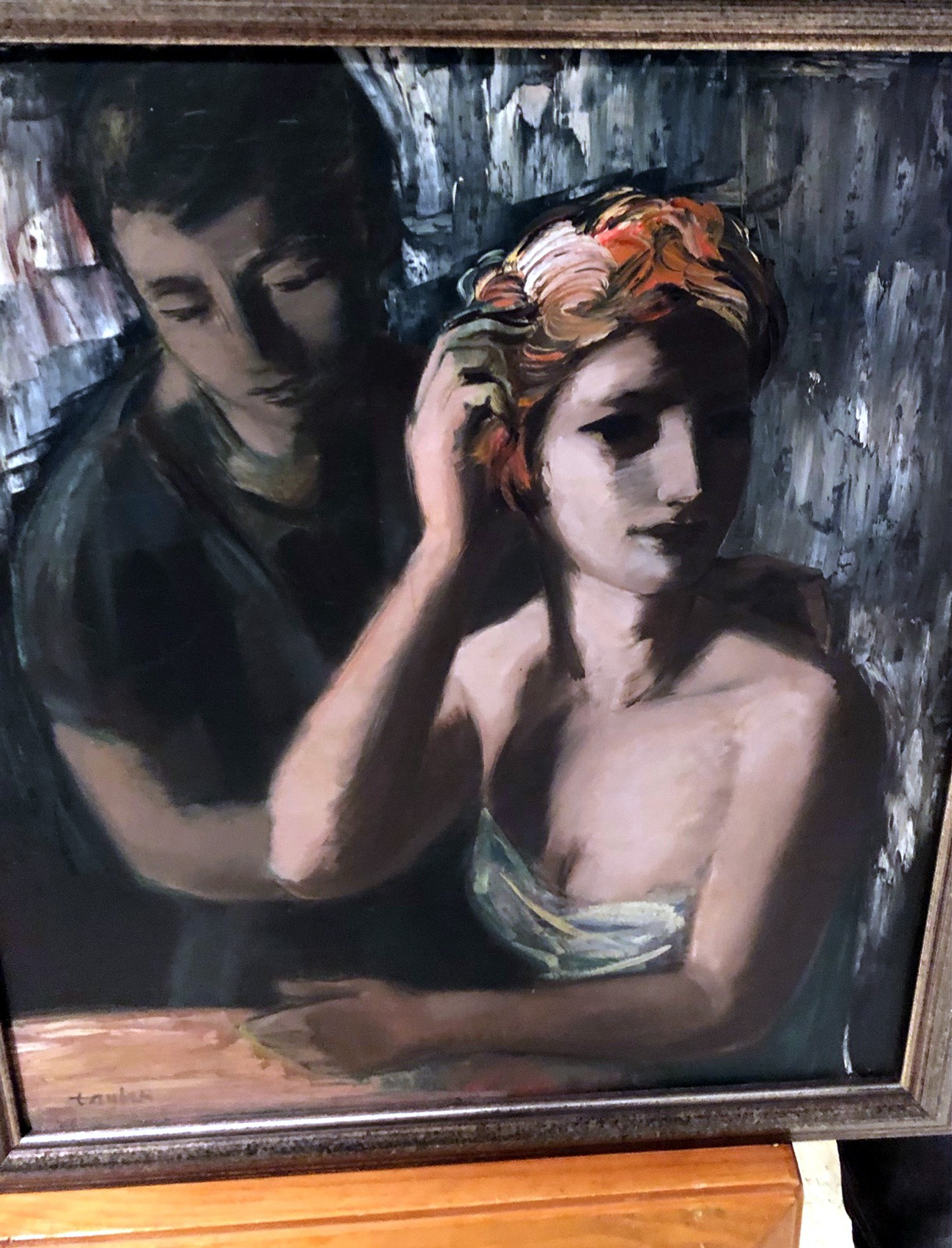 The painting is an oil on canvas, signed lower left, of a couple. The painting measures 21 x 18 in very good condition.