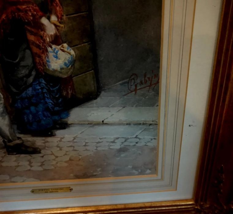 Pietro Gambrini was born in 1856 in Italy and remained active in Italy until his death in 1926. The painting is a watercolor of two people in a doorway, signed lower right and is in very good condition. The framed painting measures 23 x 28.