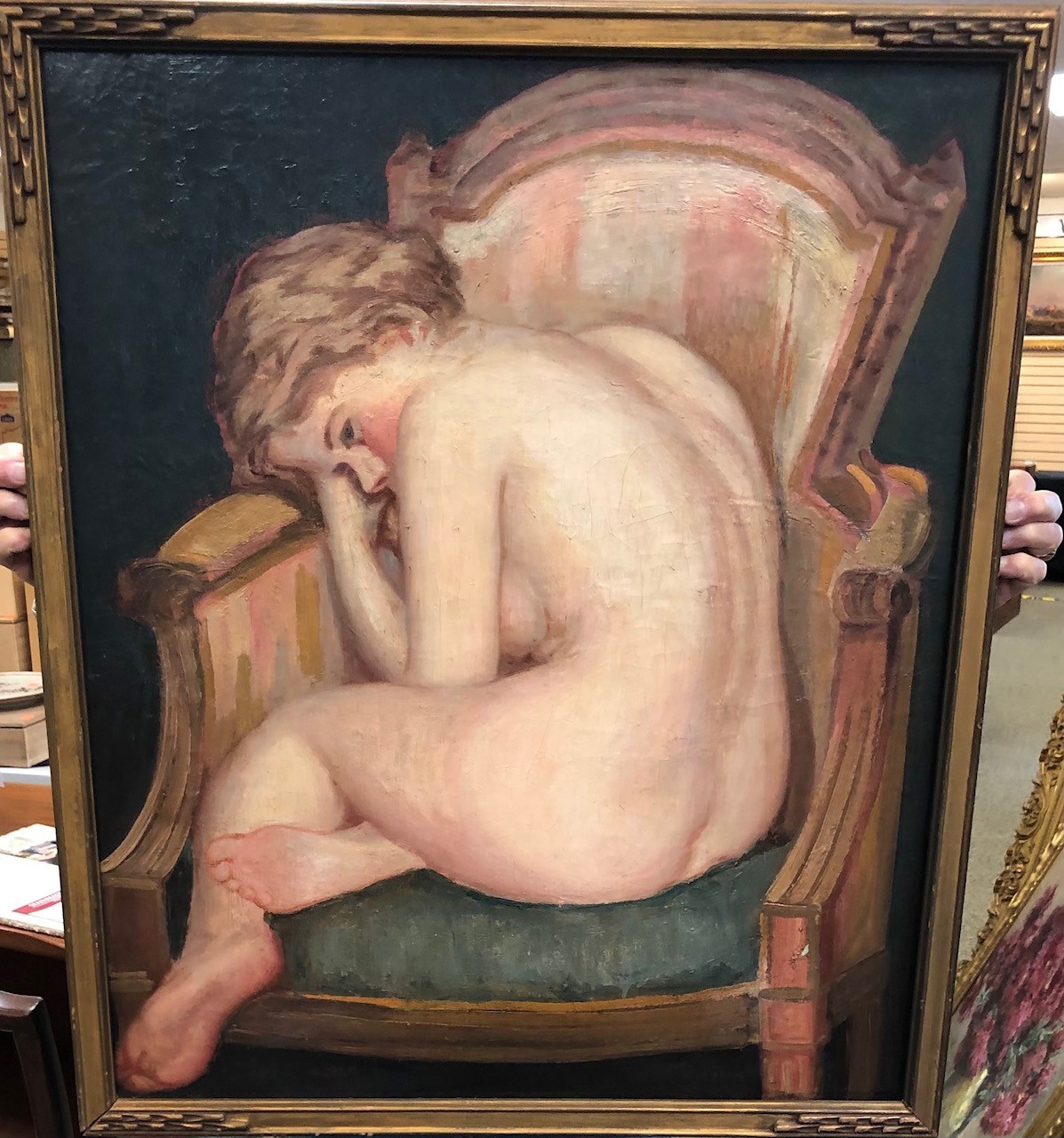 The George Luks painting of a nude girl reclining in a chair, is an oil on canvas, signed lower right and framed in an arts and crafts frame of the period.