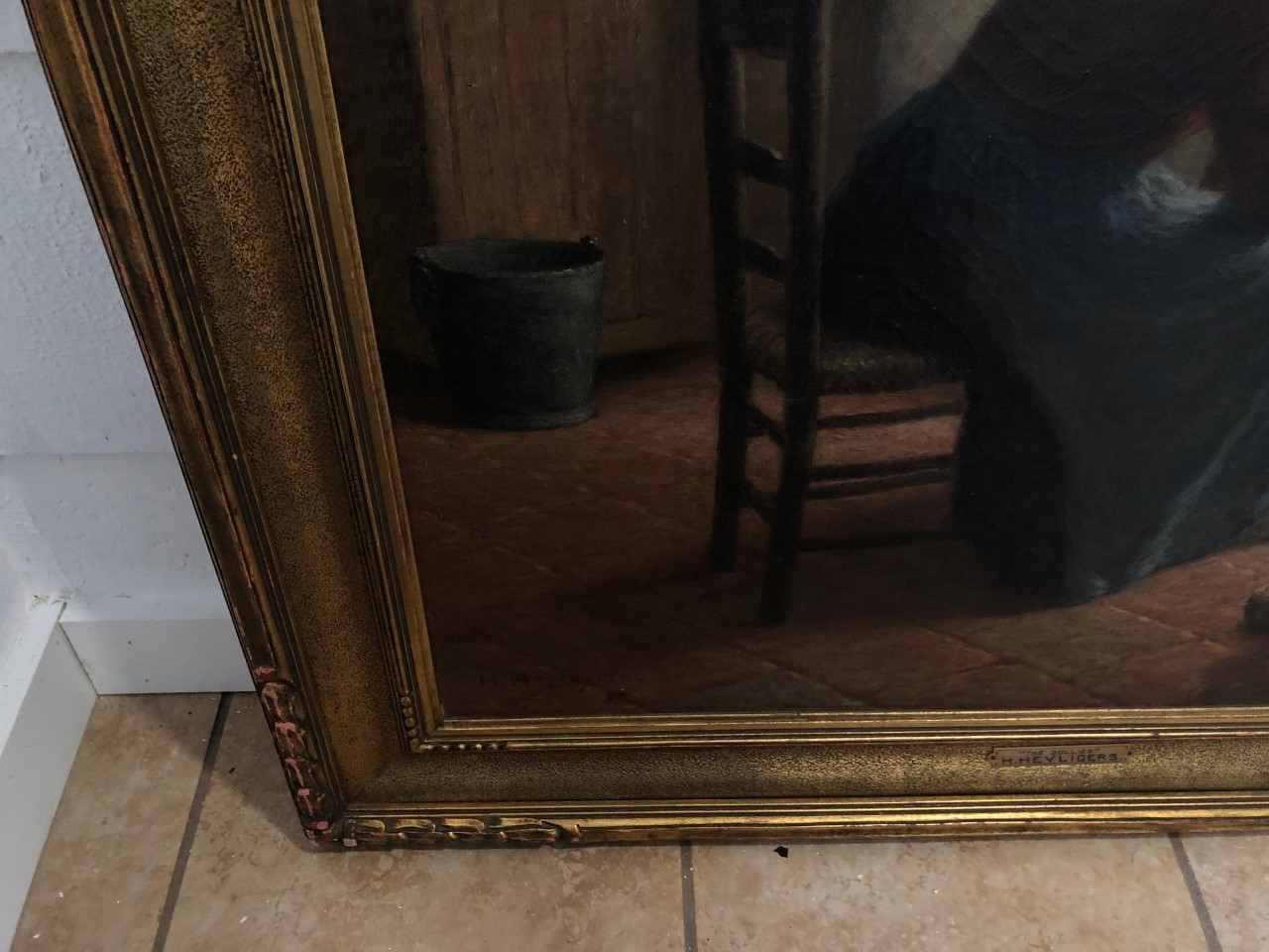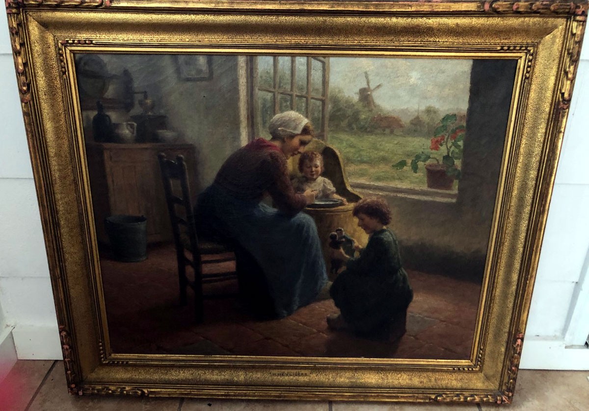 Hendrik Heyligers, born in 1877 and died in Paris, France, in 1967. Heyligers was born in Batavia, which is now part of Indonesia. He studied in Paris, Munich, and The Hague. Heyligers tended to paint scenes of humble interiors showing families in daily tasks in the kitchen, the heart of the Dutch home. The painting is 30 x 35 with the frame. The image is signed lower left. A New House Gallery label titled “The Dollies” is on the verso.