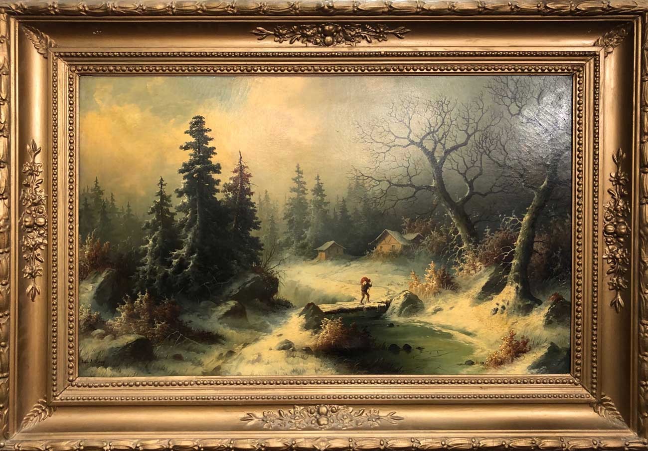 Signed:  lower right. Scene:  winter landscape