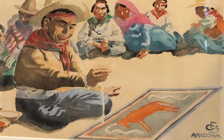 This painting is a gouache/mixed media initialed on the right side with Arizona printed underneath the initials. The painting is in a decorative original frame measuring 18 x 22 including frame. The painting depicts possibly Mexican origins of a group of people watching a young man in the foreground with a rug displayed in front of him.