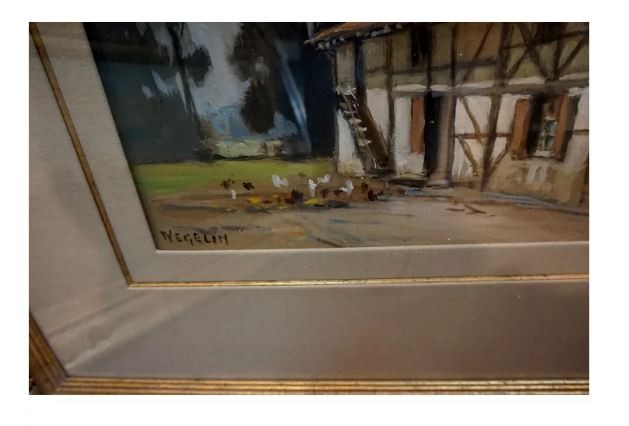 The painting is gouache on paper of a house in Normandy, France. The artist is Emile Wegelin (1875-1962) he is a French artist. The painting measures 14 x 20 in a gold frame under glass. The painting is in excellent condition and ready to hang in your home.