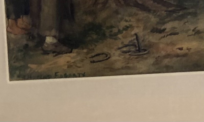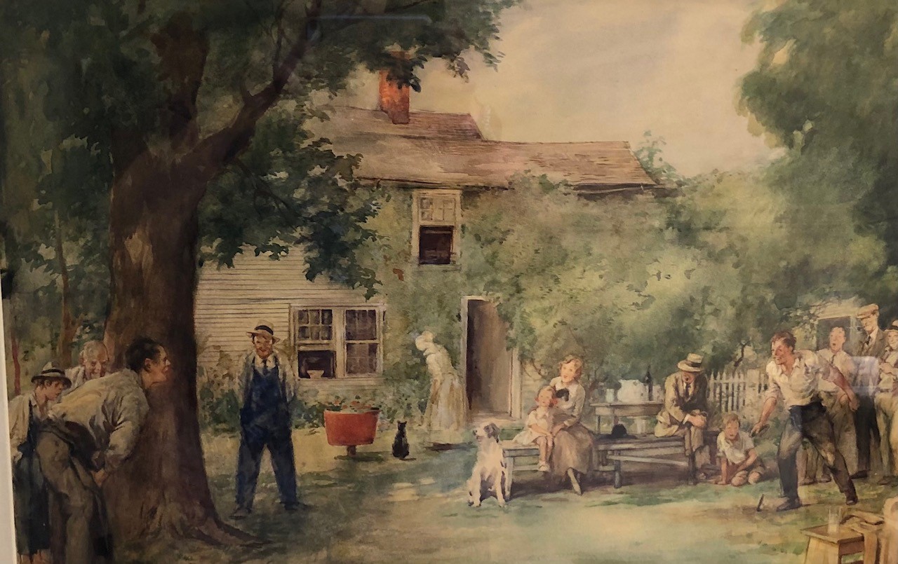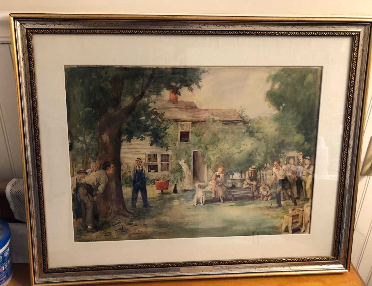 Thomas Fogarty. American. Original watercolor illustration depicting a farmyard genre scenewith people gathering and playing horseshoes. Framed under glass. Signed lower left