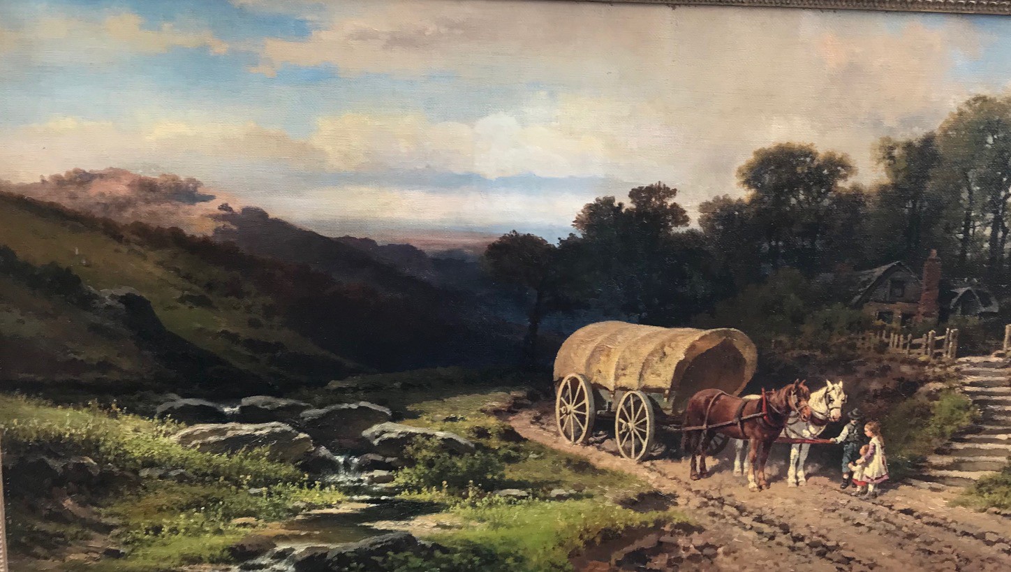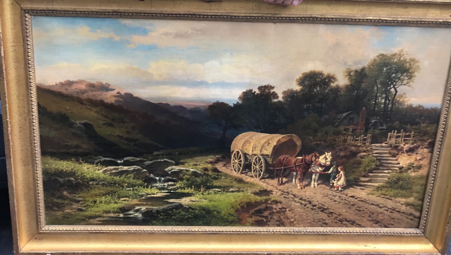 Size: 25 x 40 inc. frame Medium: oil on canvas. Scene: landscape with a covered wagon and children tending the animals