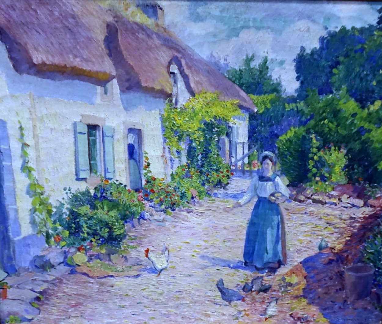 Abel Warshawsky was born in 1883 in Sharon, Pennysylvania, he was raised in Cleveland, Ohio. He studied at the Cleveland Art Institute, National Academy of Design and the Art Students League. Mr. Warshawsky left for Paris in 1905. He lived and painted in Europe for the next 25 years. The painting by Mr. Warshawsky is from the time he spent in Europe. The woman is dressed in typical clothing of the time feeding the chickens, with a thatched roof building behind her. The painting is an oil on canvas signed on the lower left and dated 1914. The painting is in excellent condition in a plain gold frame. Mr. Warshawsky moved back to the United States in 1940 and settled in Carmel, CA until his death in 1962