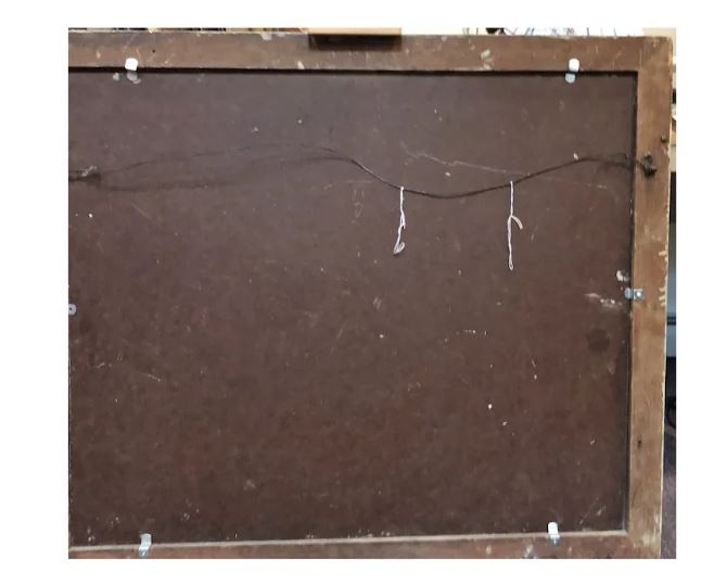 This colorful painting is an oil on board signed lower left in a plain gray frame.