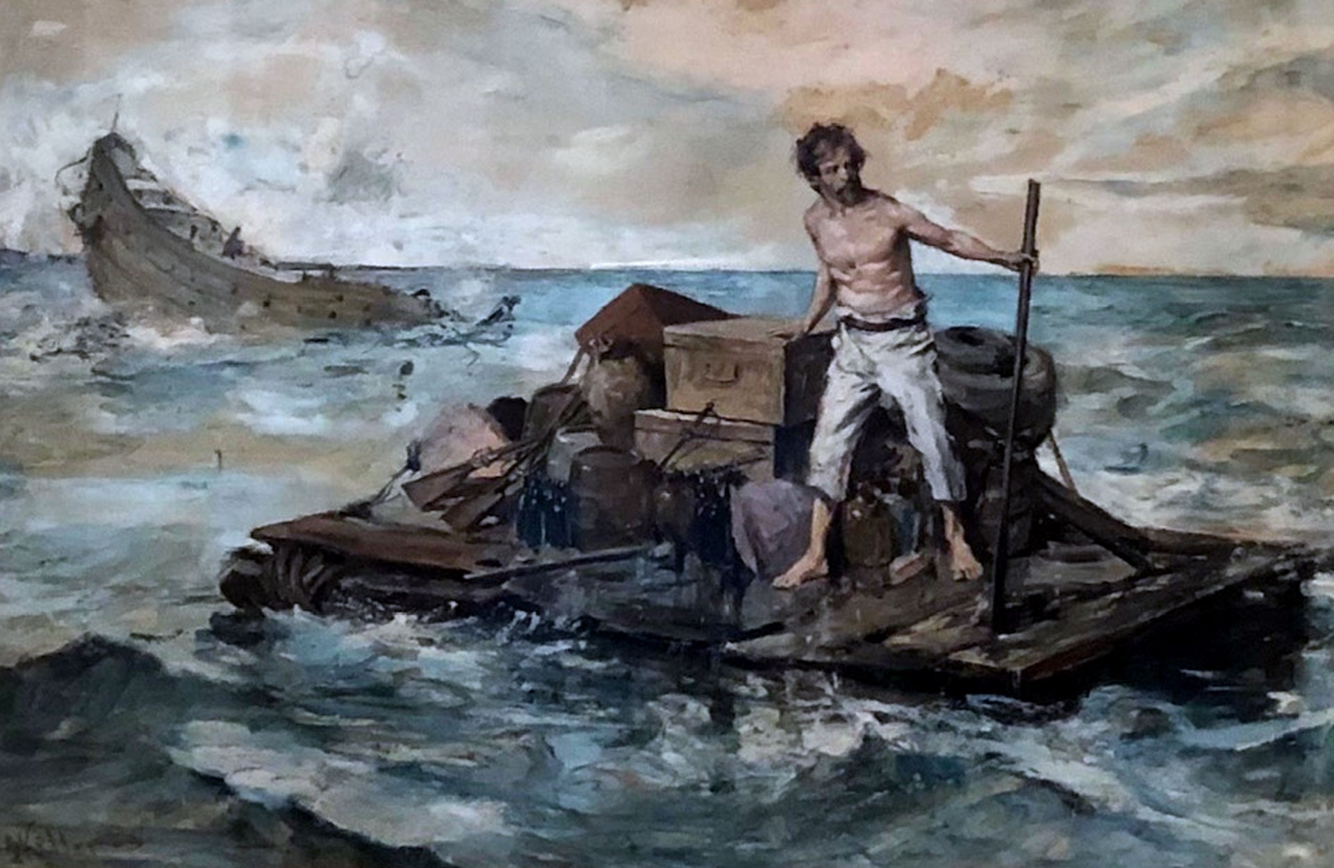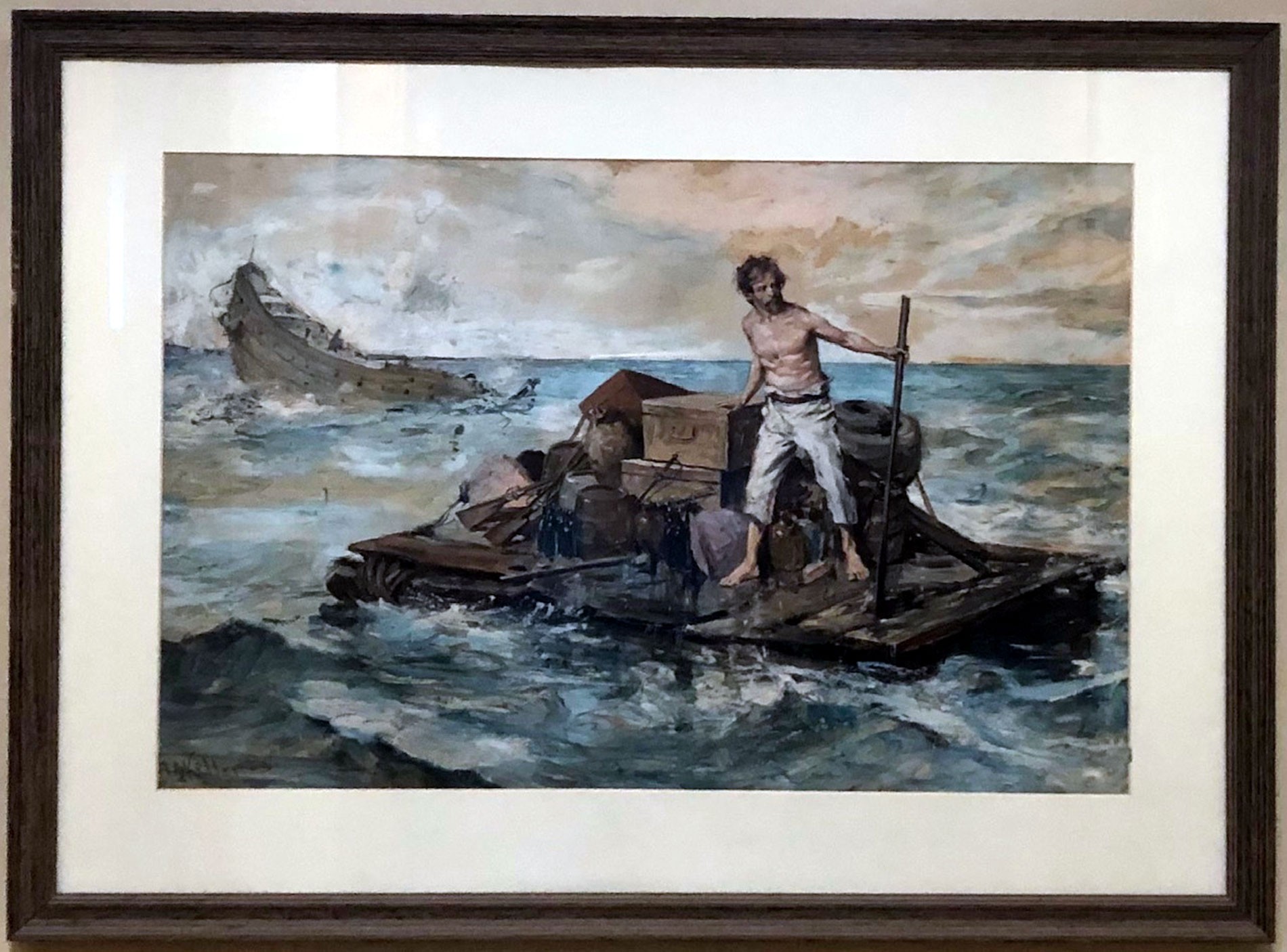 Arthur Ignatius Keller was born in 1866 in New York City.  Keller studied at 17 at the National Academy of Design in New York.  He went to Germany to study for two years before returning to New York.   During the mid-1890’s, illustrative art for magazines and books became very popular.  Keller, out of financial necessity, started to work as an illustrator at the New York Herald.  This illustration of a man with his belongings on a raft in the ocean is a watercolor signed lower right.