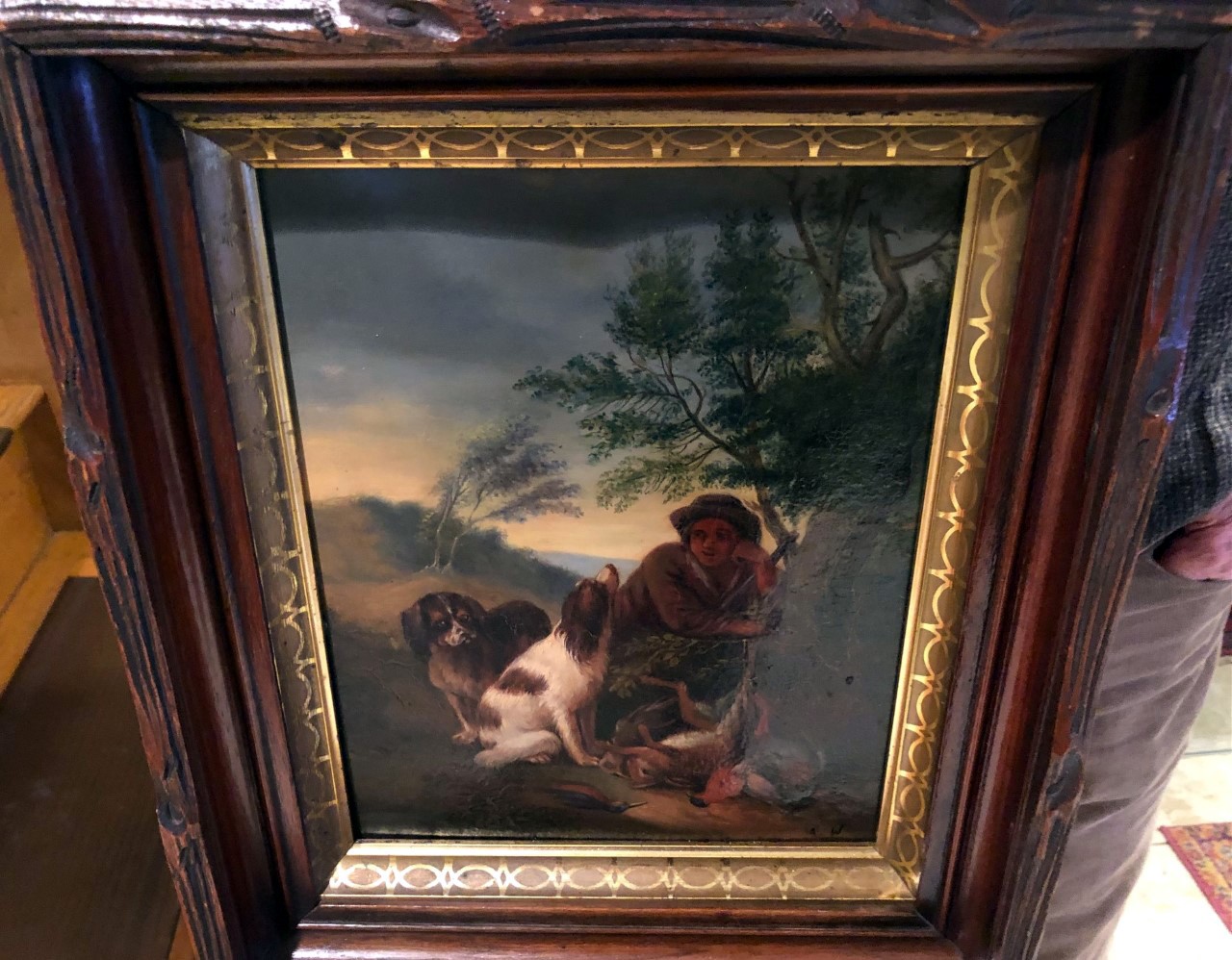The painting of the hunter and his two dogs with his game is an oil on board measuring 10x8 and nicely framed and initialed A.W.