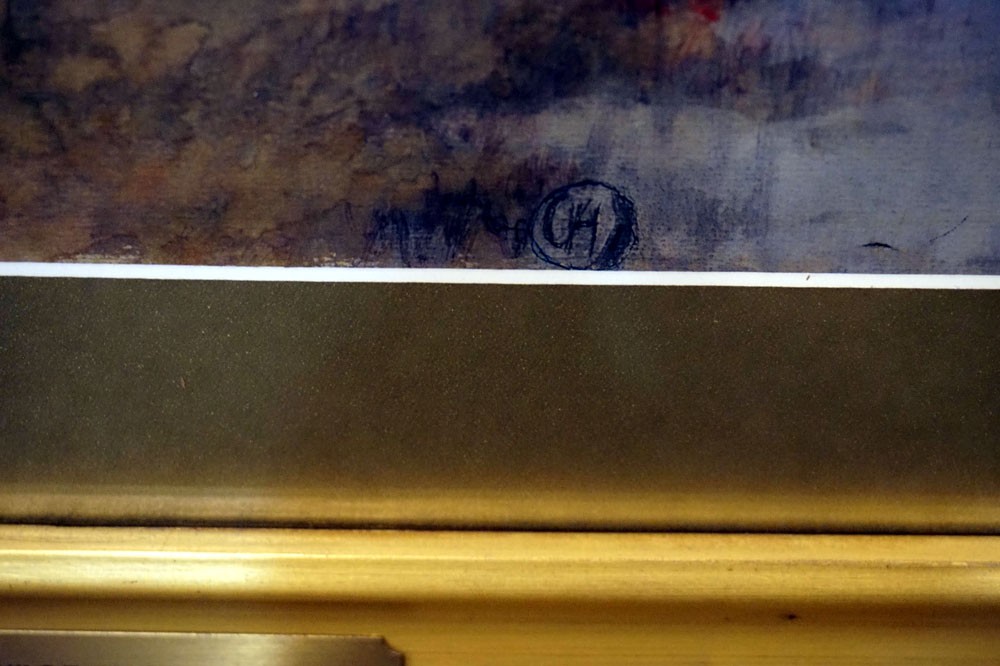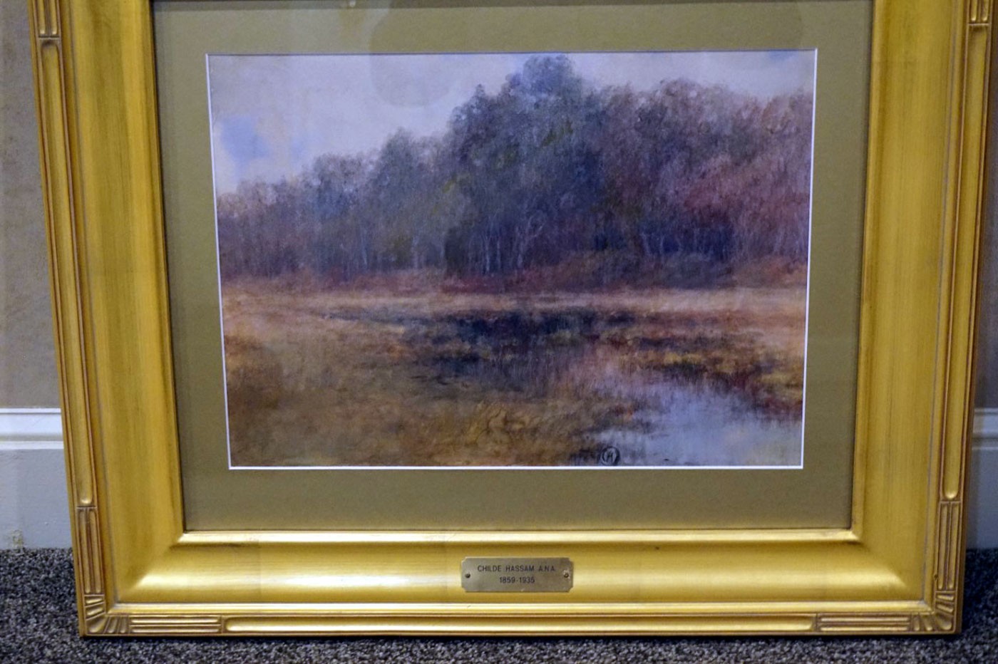 Childe Hassam – Childe Hassam was born in Dorchester, Massachusetts in 1859, died in 1935 in East Hampton, New York   Mr. Hassam was most noted for his impressionist paintings.  He quit high school to become a wood engraver and an illustrator in 1870.  In 1883 he traveled to Europe to study at Academie Julian to finish his education in Europe.  He had already studied art at the Lowell Institute and the Boston Art Club and was elected to the National Academy.  In 1890, Mr. Hassam became active in New York exhibiting at the Players Club and the Society of American Artists.  He was the founder of Ten American Painters which he defected from the National Academy of Design and a member of the Old Lyme School in Connecticut.  The painting is a watercolor of a landscape possibly somewhere in Connecticut by the great impressionist Childe Hassam.