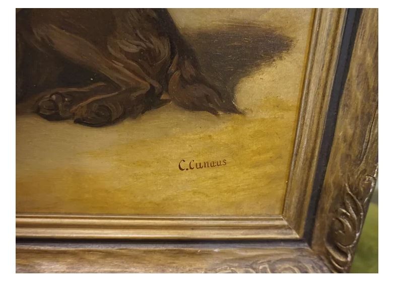 This dog portrait is signed lower right C.Cunaus. The portrait is an oil on canvas painting in very good condition. The painting measures with the frame 16 x 22.