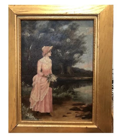 The painting his a single woman walking along a pond.