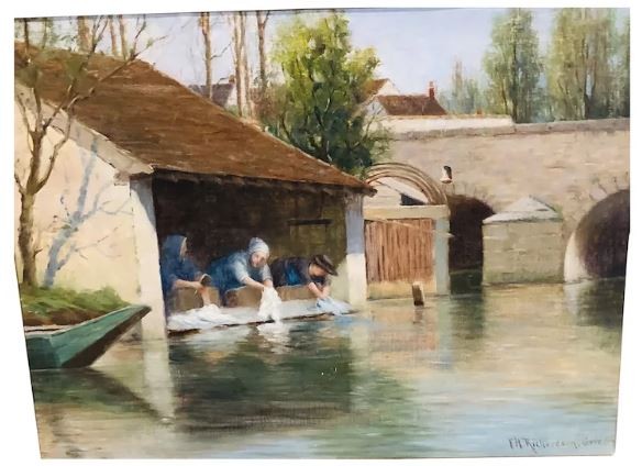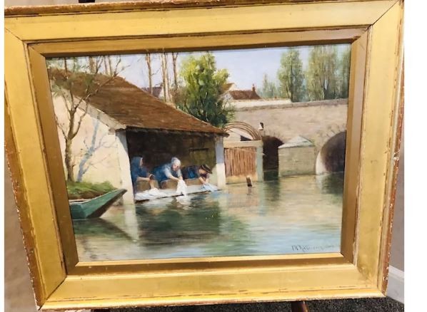 This is a nice rendition of laundry day in France. The painting is an oil on canvas, signed on the lower left, and is in its original frame measuring 27 x 34. It is in good condition.