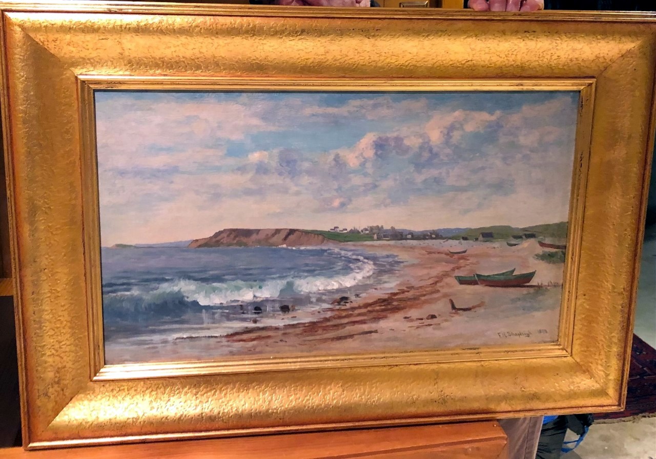 This painting is an oil on canvas, measuring 14 x 18, and signed on the lower right and dated 1889.  The frame is a flat gilded frame.  The seascape is titled on the back a beach in Scituate, Massachusetts.