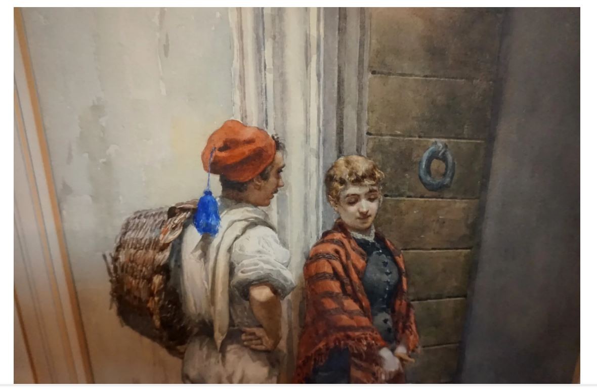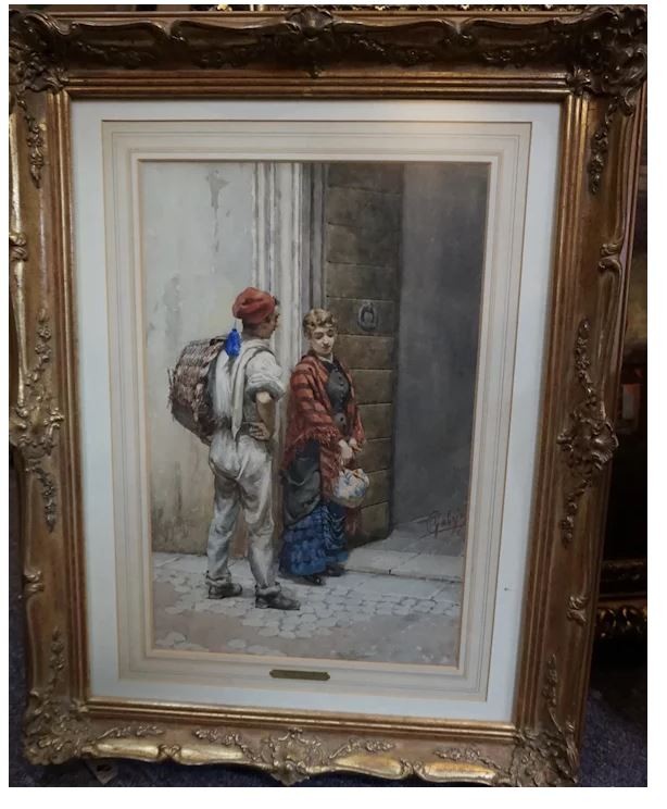 Pietro Gambrini was born in 1856 in Italy and remained active in Italy until his death in 1926. The painting is a watercolor of two people in a doorway, signed lower right and is in very good condition. The framed painting measures 23 x 28.