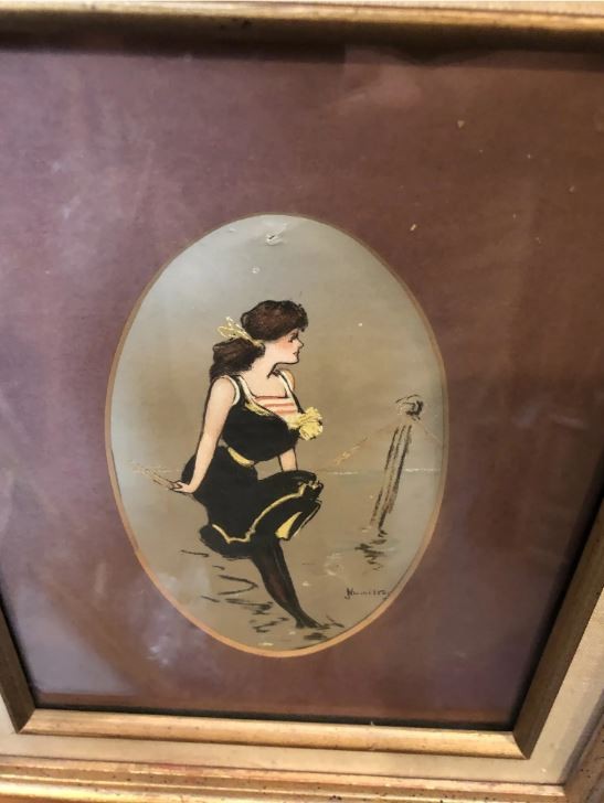 The illustration is an oil on panel, signed lower right Hamilton. There is not a biography on this artist. The illustration is of a woman in a bathing suit, it is nicely matted and in a plain frame.