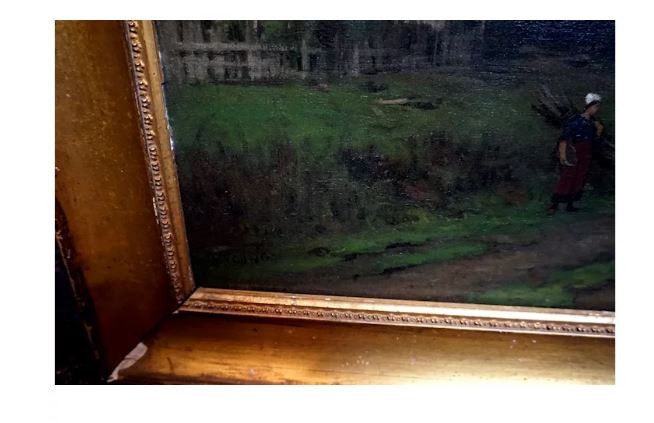 The painting is an oil on canvas signed lower left. The painting measures 18 x 25 in a gold frame that needs a little work. The piece is in good condition.