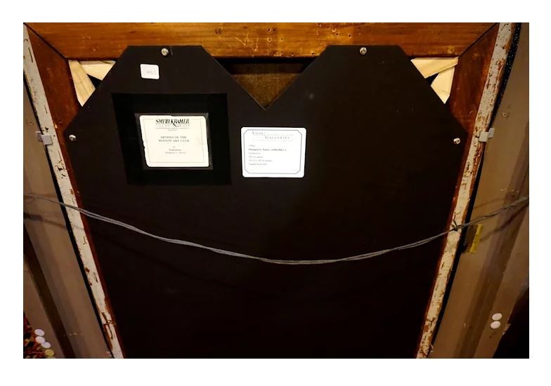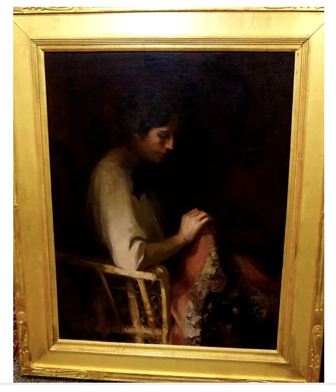 The portrait is called the "Seamstress" an original oil on canvas painting signed lower left. The painting including the gold frame measures 48 x 39. The painting is in very good condition with a Vose Gallery and a Boston Art Club label from Smith Kramer Fine Art.