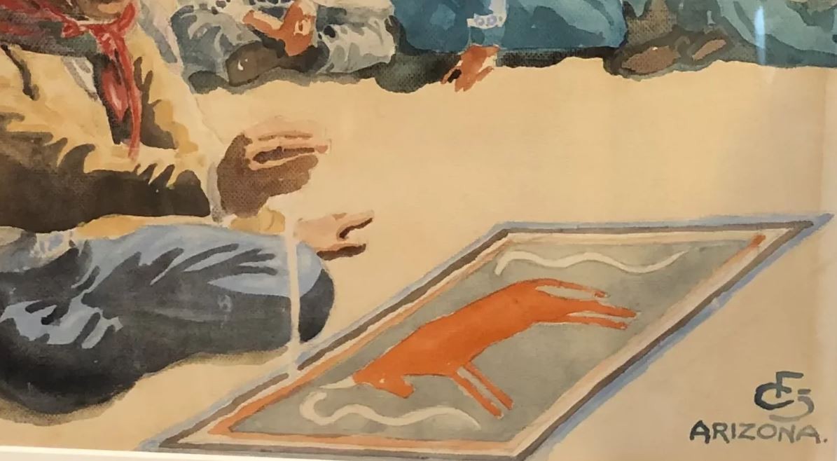 This painting is a gouache/mixed media initialed on the right side with Arizona printed underneath the initials. The painting is in a decorative original frame measuring 18 x 22 including frame. The painting depicts possibly Mexican origins of a group of people watching a young man in the foreground with a rug displayed in front of him.