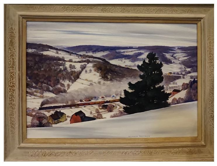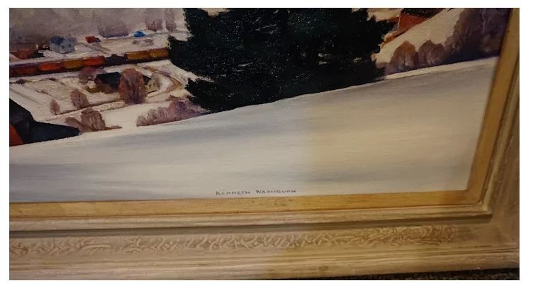 This painting is an original oil on canvas signed on the lower right by Kenneth Washburn. The winter landscape is possibly in upstate New York. The back of the painting has an exhibition label and measures 28 x 38 including the frame. The painting is in very good condition.