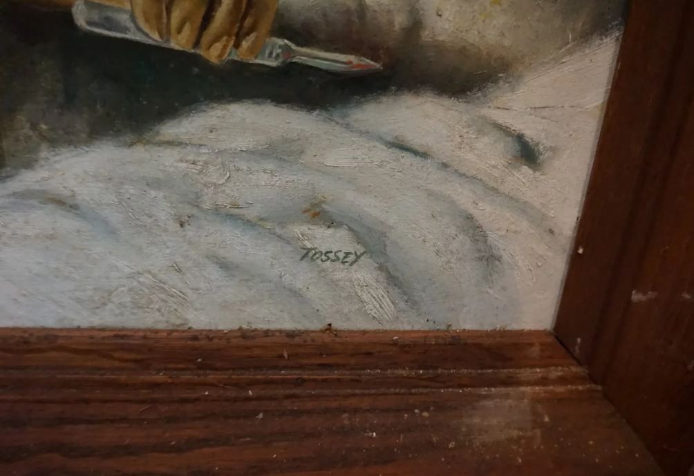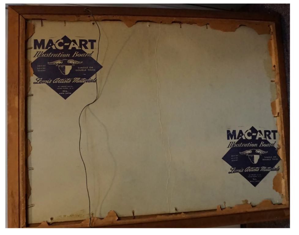 This is an interesting illustration of a battle scene with a nurse and doctor working on a wounded soldier, while the war rages on behind them. The painting is oil on artist board signed on the lower right. It is framed in a plain wood frame and measures 29 x 22. The painting is in good condition.