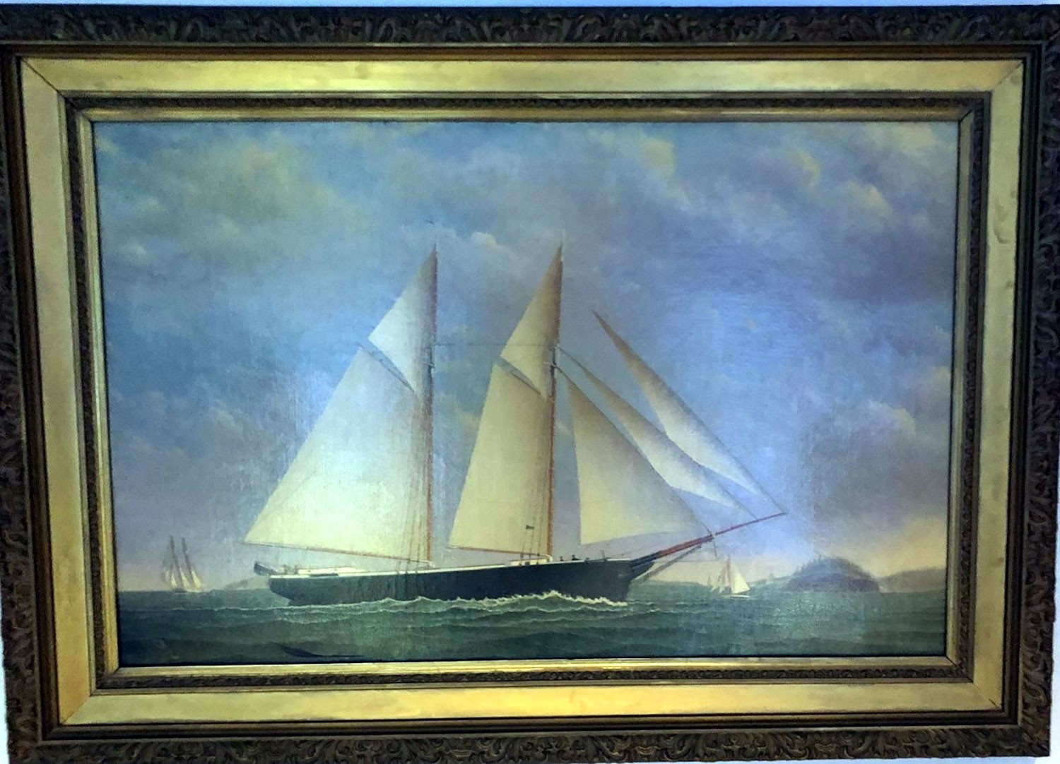 James Babbidge was born in 1844 and died in Maine in 1919.  There is very little biographical information on this artist.   He is known for his ship portraits.  The painting is a ship portrait of the “Commerce” it is an oil on canvas relined, initialed on the buoy