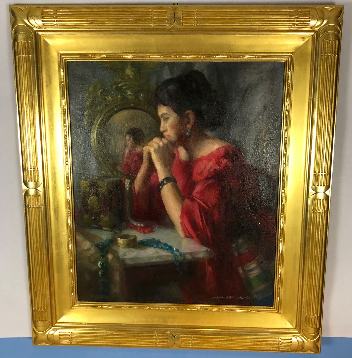 The painting by Margurite Pearson is an oil on canvas signed lower right. The image depicts a woman at a dressing table and measures 41.5 x 36.5. Pric