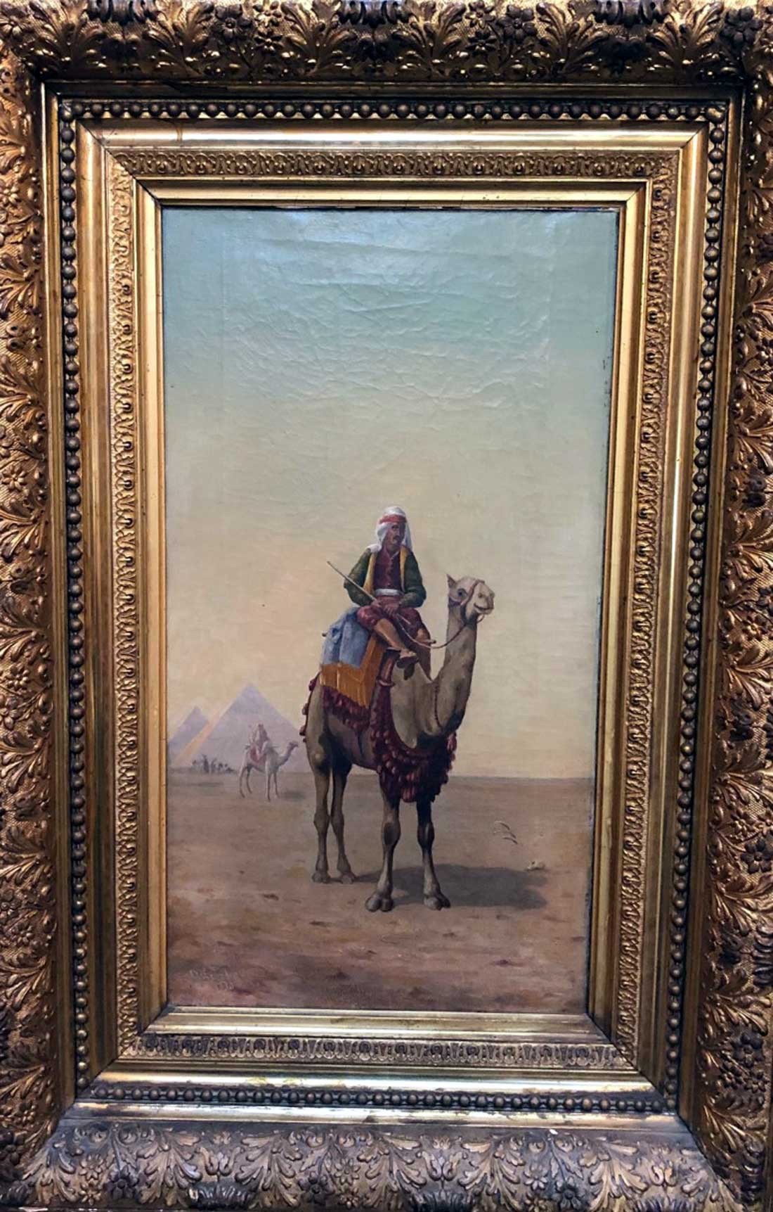 This is a well painted rendering of a camel and rider. It is signed on the lower left of the painting, but we were unable to figure out the signature. It is an oil on canvas painting, nicely framed measuring 32 x 22.