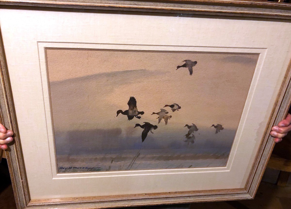 The watercolor of ducks flying over a marsh, signed on the lower left.